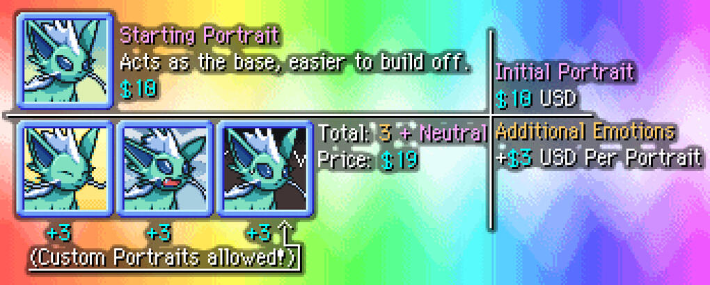 In-depth pricing guide.Alternate variants, including "no accessories", alt accessories (christmas set, birthday hat, halloween costume, etc) or flipped (like Absol or Leafeon), cost an extra $1.5 per portrait.